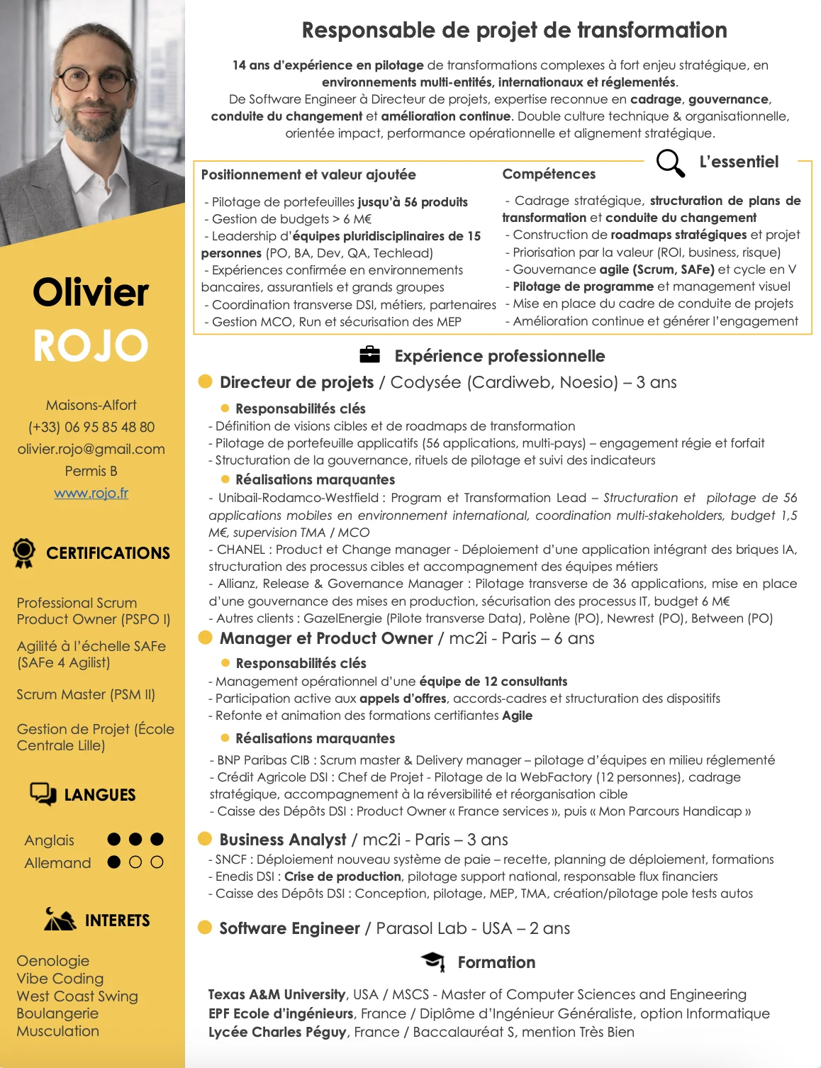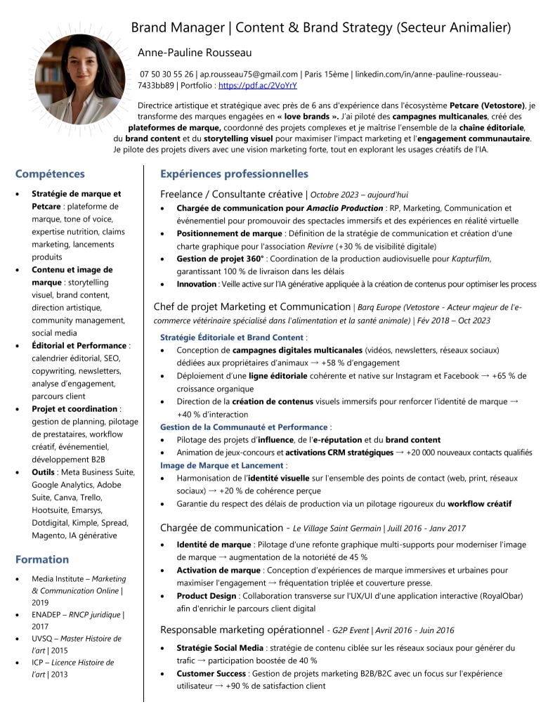 - Réécrit le contenu du CV sans inventer d'expériences ni déformer le parcours du candidat