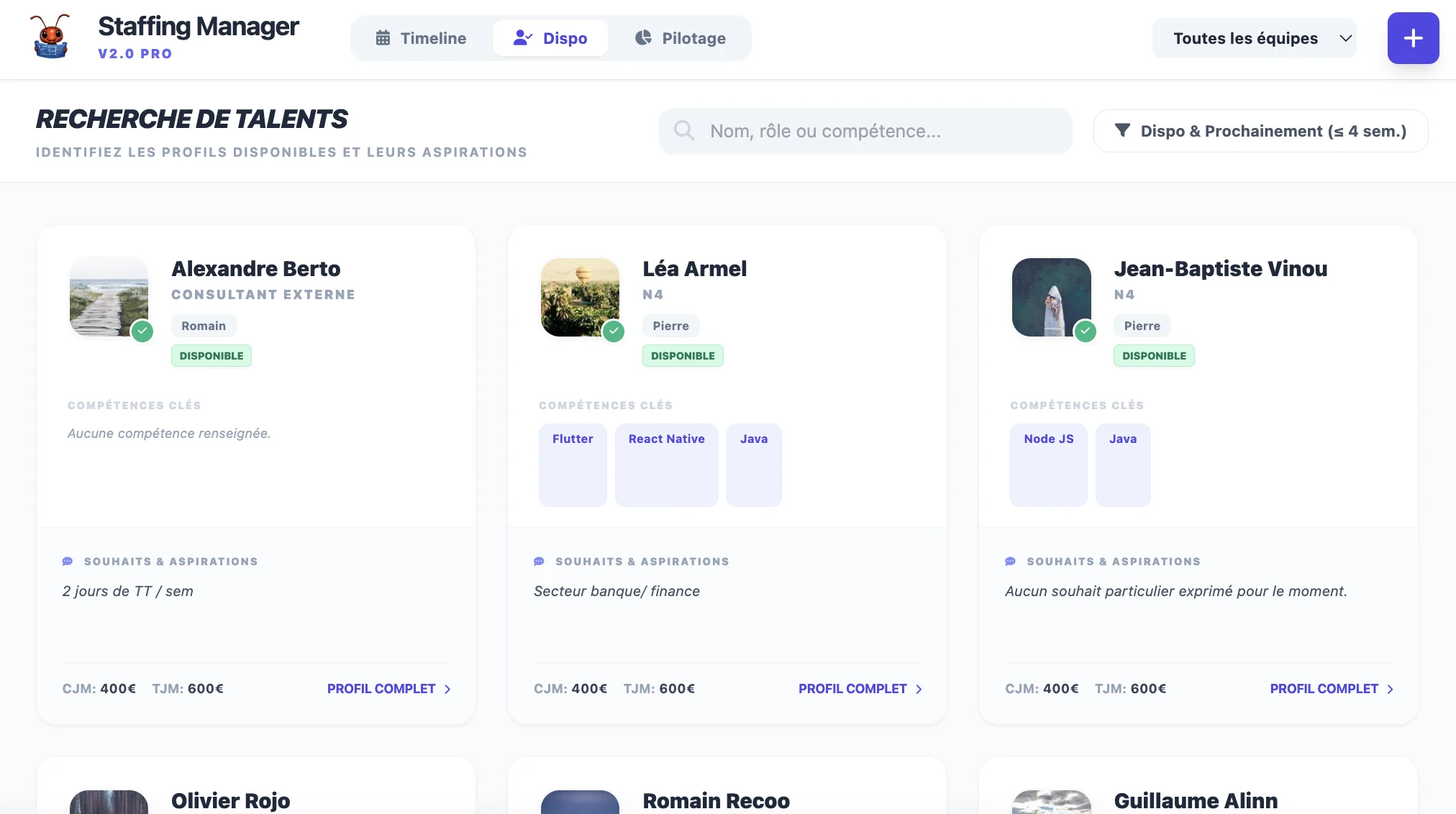- Vue Dispo : compétences clés, séniorité et souhaits de mission pour chaque personne