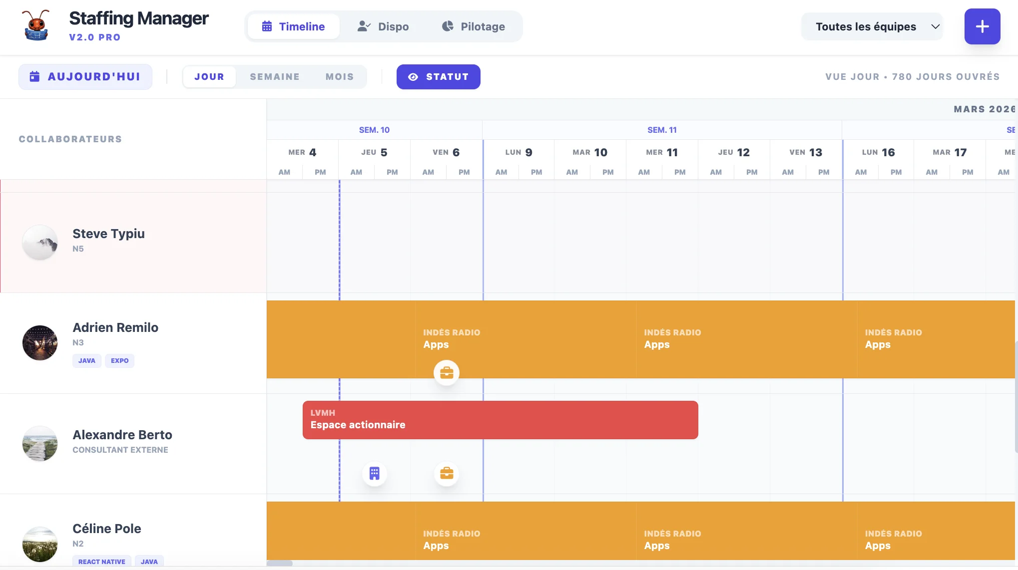 - Vue Timeline : staffing à la demi-journée (AM / PM) avec drag-and-drop et modes bureau / télétravail / chez le client